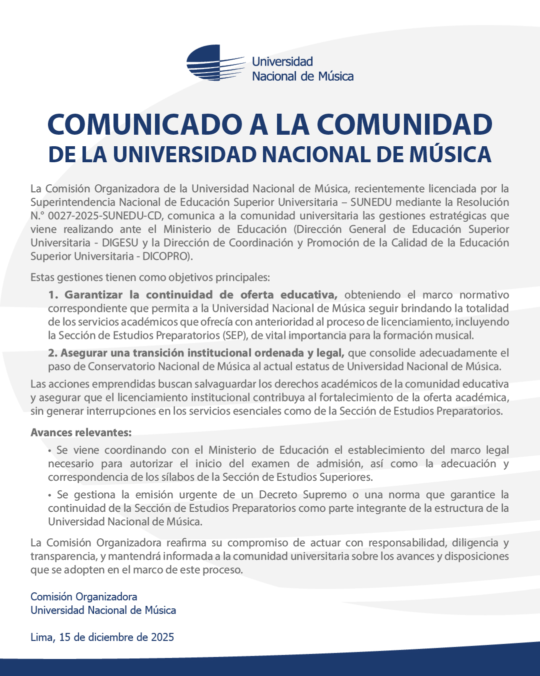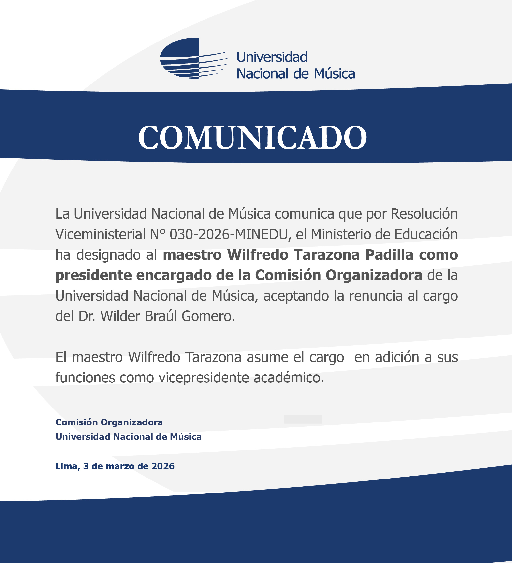 En esta página podrás acceder a todos los comunicados oficiales de la Universidad Nacional de Música, concernientes a diversos anuncios de importancia para la comunidad institucional y público en general.